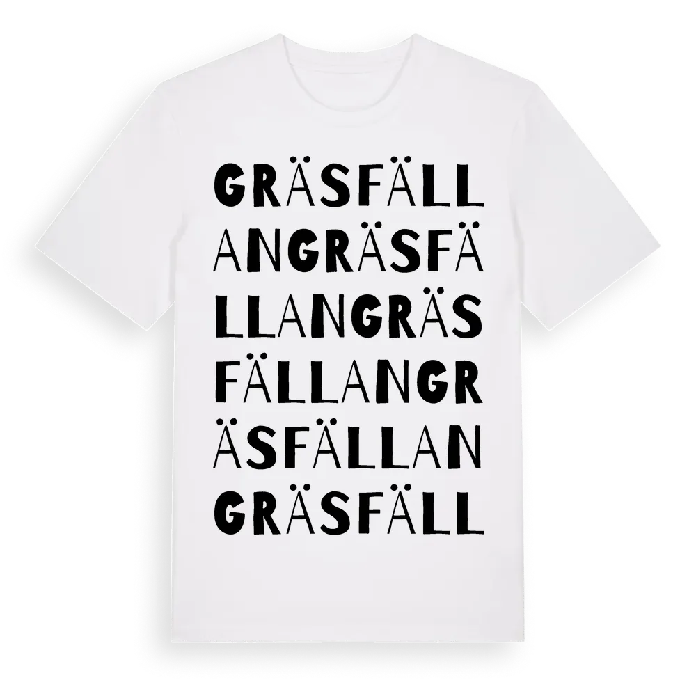Gräsfällan ordlek t-shirt är inspirerad av Gräsfällan i Kronobergs län, Sverige. Tröjan är designad för dig som har en speciell koppling till platsen – oavsett om du bor här, har rötterna här eller bara älskar Gräsfällan.