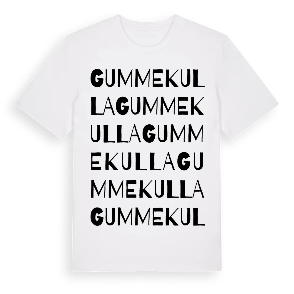 Gummekulla ordlek t-shirt är inspirerad av byn Gummekulla i Kronobergs län, Sverige. Tröjan är designad för dig som har en speciell koppling till platsen – oavsett om du bor här, har rötterna här eller bara älskar Gummekulla.