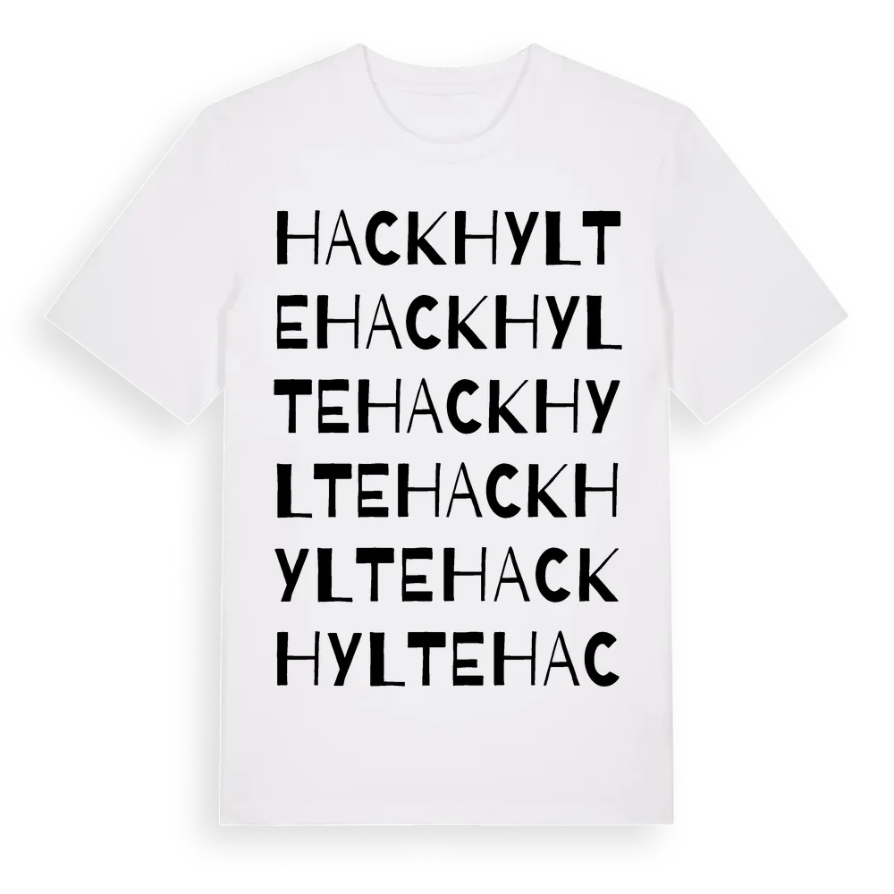 En ordlek byggd på Hackhyltes namn. Subtilt och klurig – ett motiv som bara de som verkligen känner platsen fullt ut förstår. Premium bomull, unisex – från Hackhylte i Kronobergs län.
