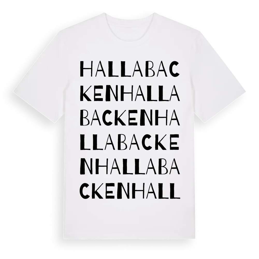 Hallabacken ordlek t-shirt är inspirerad av Hallabacken i Kronobergs län, Sverige. Tröjan är designad för dig som har en speciell koppling till platsen – oavsett om du bor här, har rötterna här eller bara älskar Hallabacken.
