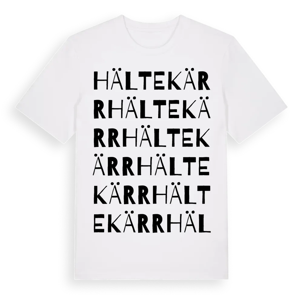 Hältekärr ordlek t-shirt är inspirerad av byn Hältekärr i Kronobergs län, Sverige. Tröjan är designad för dig som har en speciell koppling till platsen – oavsett om du bor här, har rötterna här eller bara älskar Hältekärr.