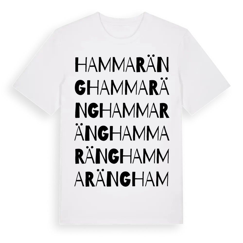 Hammaräng ordlek t-shirt är inspirerad av Hammaräng i Kronobergs län, Sverige. Tröjan är designad för dig som har en speciell koppling till platsen – oavsett om du bor här, har rötterna här eller bara älskar Hammaräng.