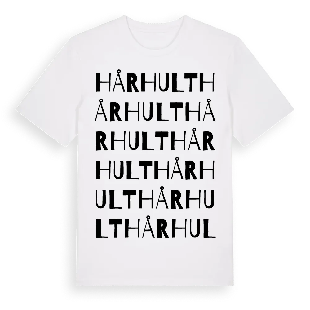 Hårhult ordlek t-shirt är inspirerad av byn Hårhult i Kronobergs län, Sverige. Tröjan är designad för dig som har en speciell koppling till platsen – oavsett om du bor här, har rötterna här eller bara älskar Hårhult.