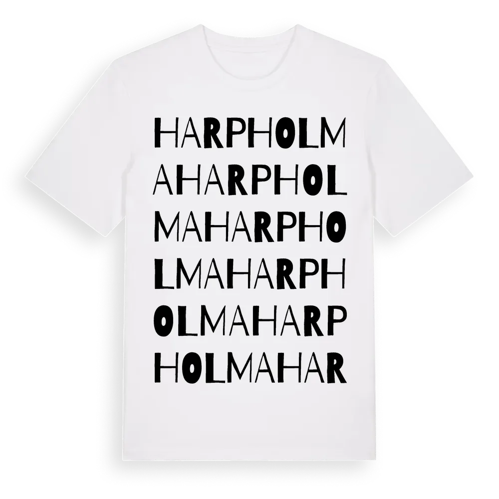 Harpholma ordlek t-shirt är inspirerad av byn Harpholma i Kronobergs län, Sverige. Tröjan är designad för dig som har en speciell koppling till platsen – oavsett om du bor här, har rötterna här eller bara älskar Harpholma.