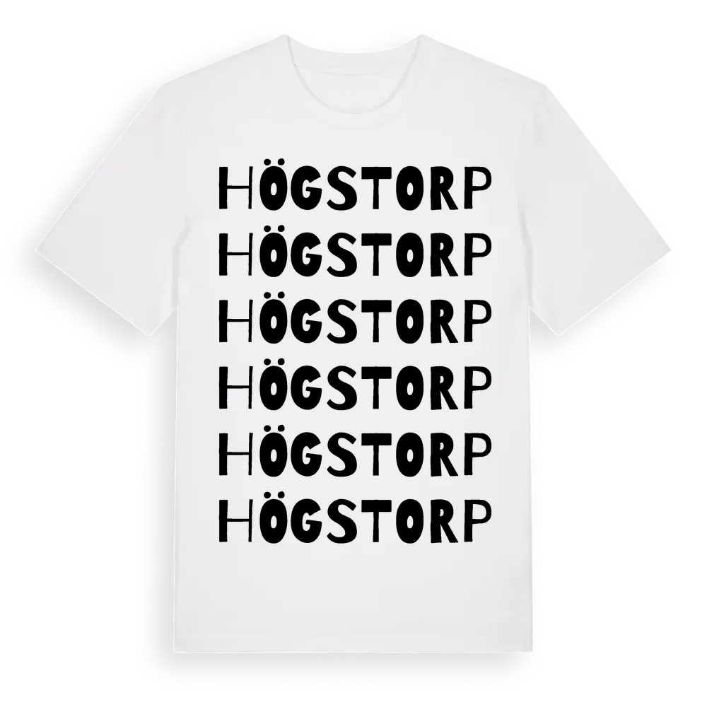 En ordlek byggd på Högstorps namn. Subtilt och klurig – ett motiv som bara de som verkligen känner platsen fullt ut förstår. Premium bomull, unisex – från stadsdelen Högstorp i Kronobergs län.