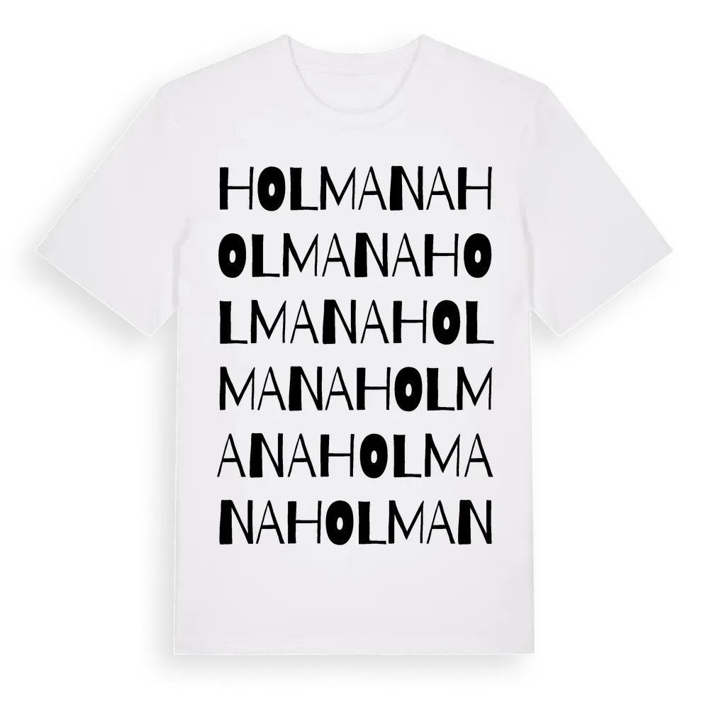 En ordlek byggd på Holmanas namn. Subtilt och klurig – ett motiv som bara de som verkligen känner platsen fullt ut förstår. Premium bomull, unisex – från byn Holmana i Kronobergs län.