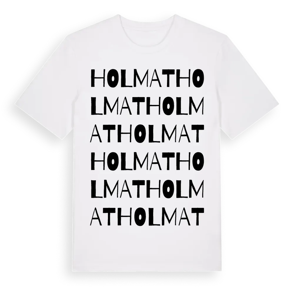 Holmat ordlek t-shirt är inspirerad av Holmat i Kronobergs län, Sverige. Tröjan är designad för dig som har en speciell koppling till platsen – oavsett om du bor här, har rötterna här eller bara älskar Holmat.