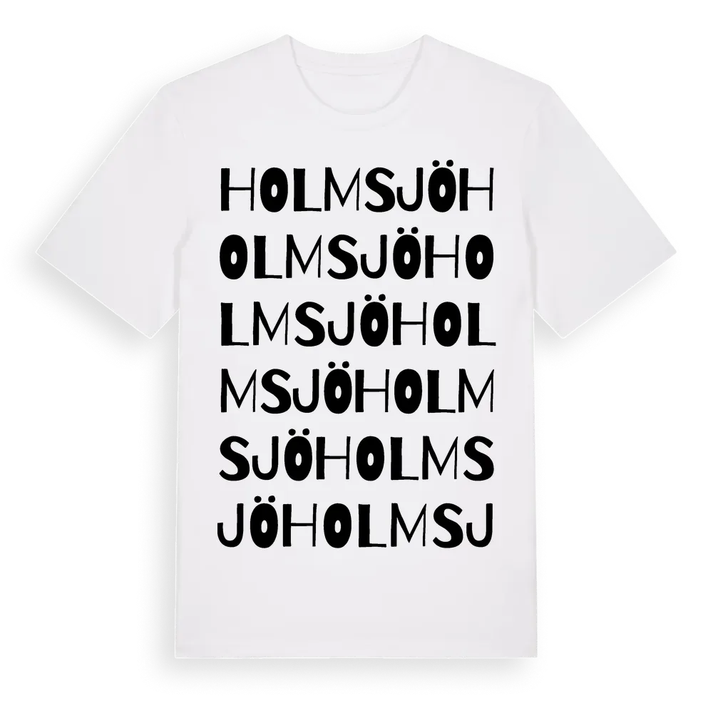 Holmsjö ordlek t-shirt är inspirerad av Holmsjö i Kronobergs län, Sverige. Tröjan är designad för dig som har en speciell koppling till platsen – oavsett om du bor här, har rötterna här eller bara älskar Holmsjö.
