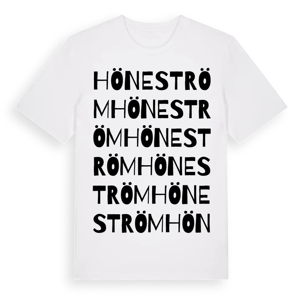 En ordlek byggd på Höneströms namn. Subtilt och klurig – ett motiv som bara de som verkligen känner platsen fullt ut förstår. Premium bomull, unisex – från Höneström i Kronobergs län.