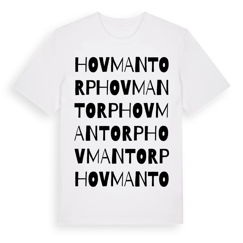 Hovmantorp ordlek t-shirt är inspirerad av byn Hovmantorp i Kronobergs län, Sverige. Tröjan är designad för dig som har en speciell koppling till platsen – oavsett om du bor här, har rötterna här eller bara älskar Hovmantorp.