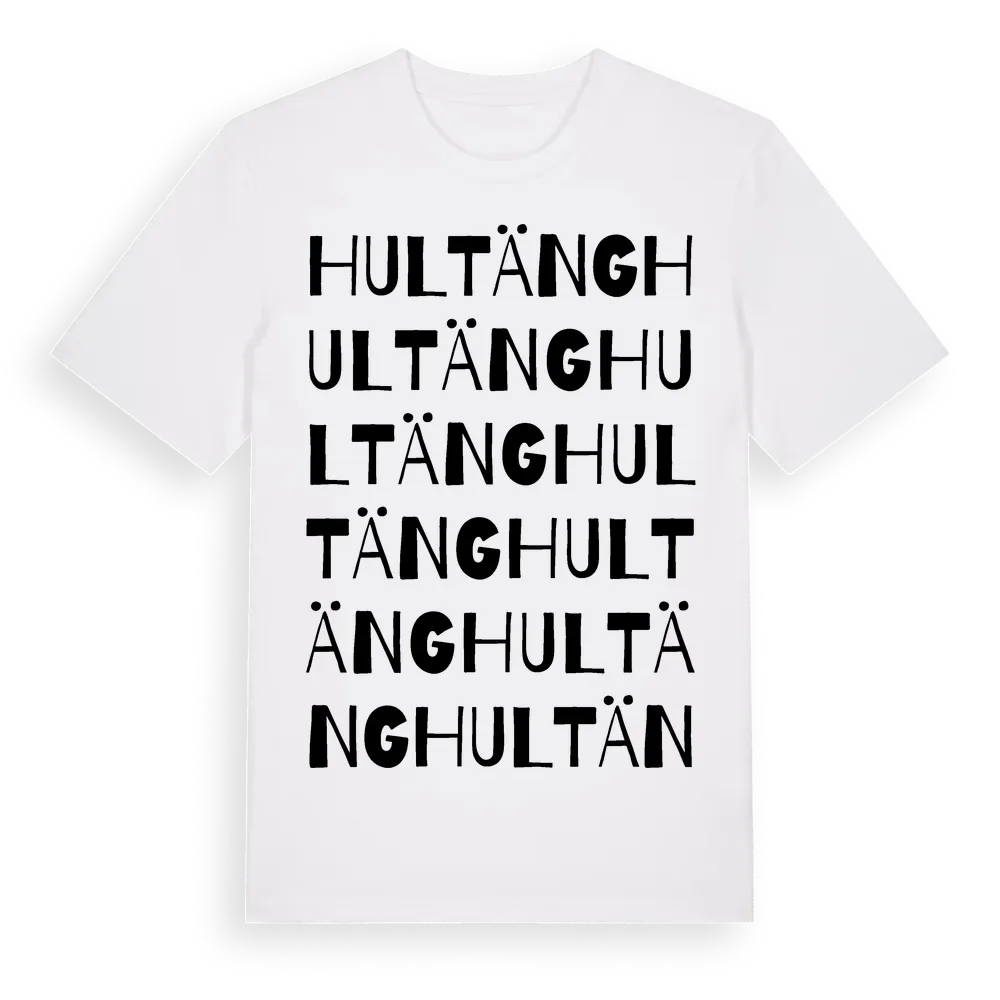 Hultäng ordlek t-shirt är inspirerad av Hultäng i Kronobergs län, Sverige. Tröjan är designad för dig som har en speciell koppling till platsen – oavsett om du bor här, har rötterna här eller bara älskar Hultäng.