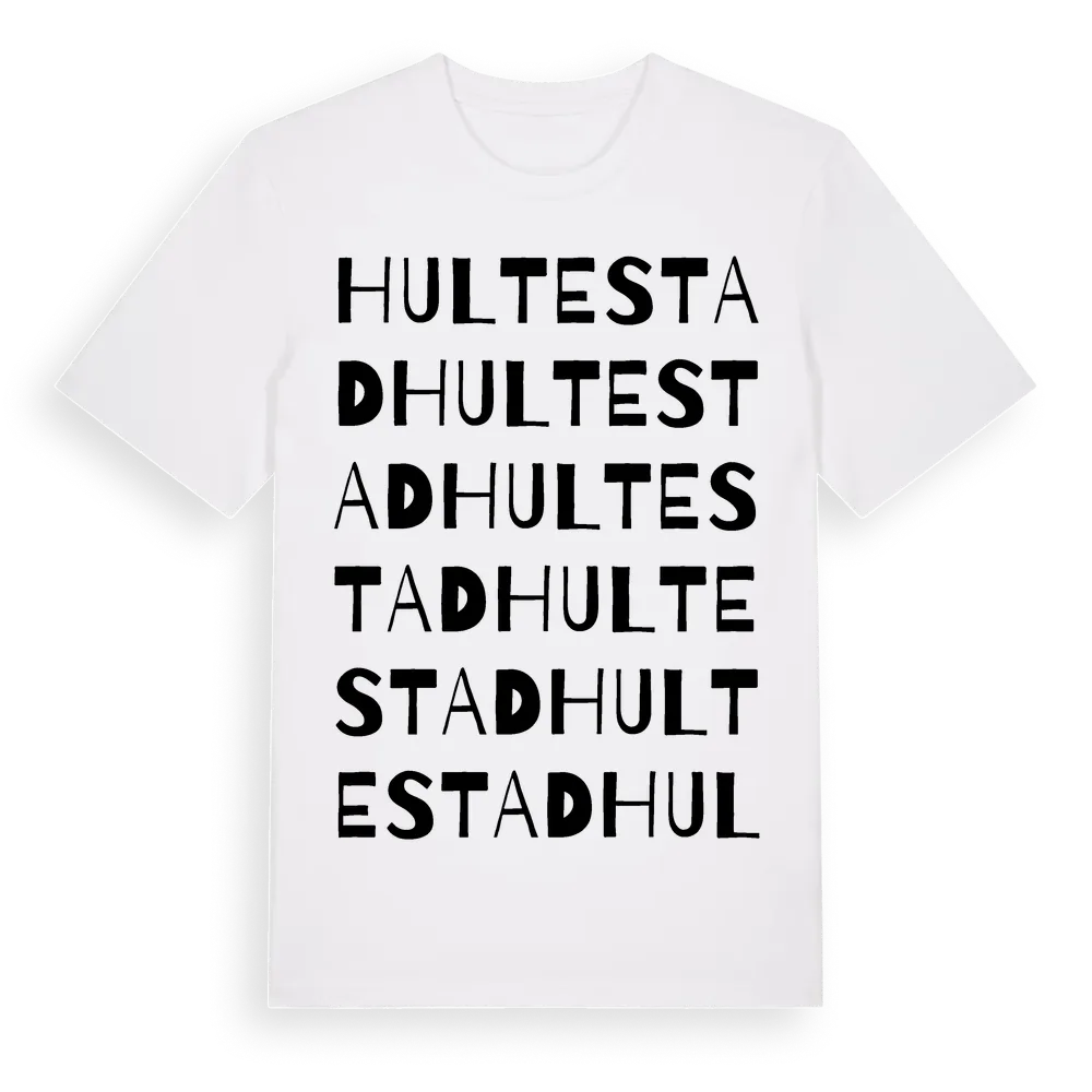 Hultestad ordlek t-shirt är inspirerad av Hultestad i Kronobergs län, Sverige. Tröjan är designad för dig som har en speciell koppling till platsen – oavsett om du bor här, har rötterna här eller bara älskar Hultestad.