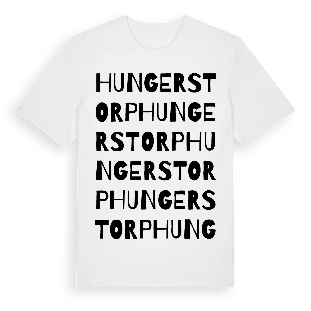 En ordlek byggd på Hungerstorps namn. Subtilt och klurig – ett motiv som bara de som verkligen känner platsen fullt ut förstår. Premium bomull, unisex – från byn Hungerstorp i Kronobergs län.