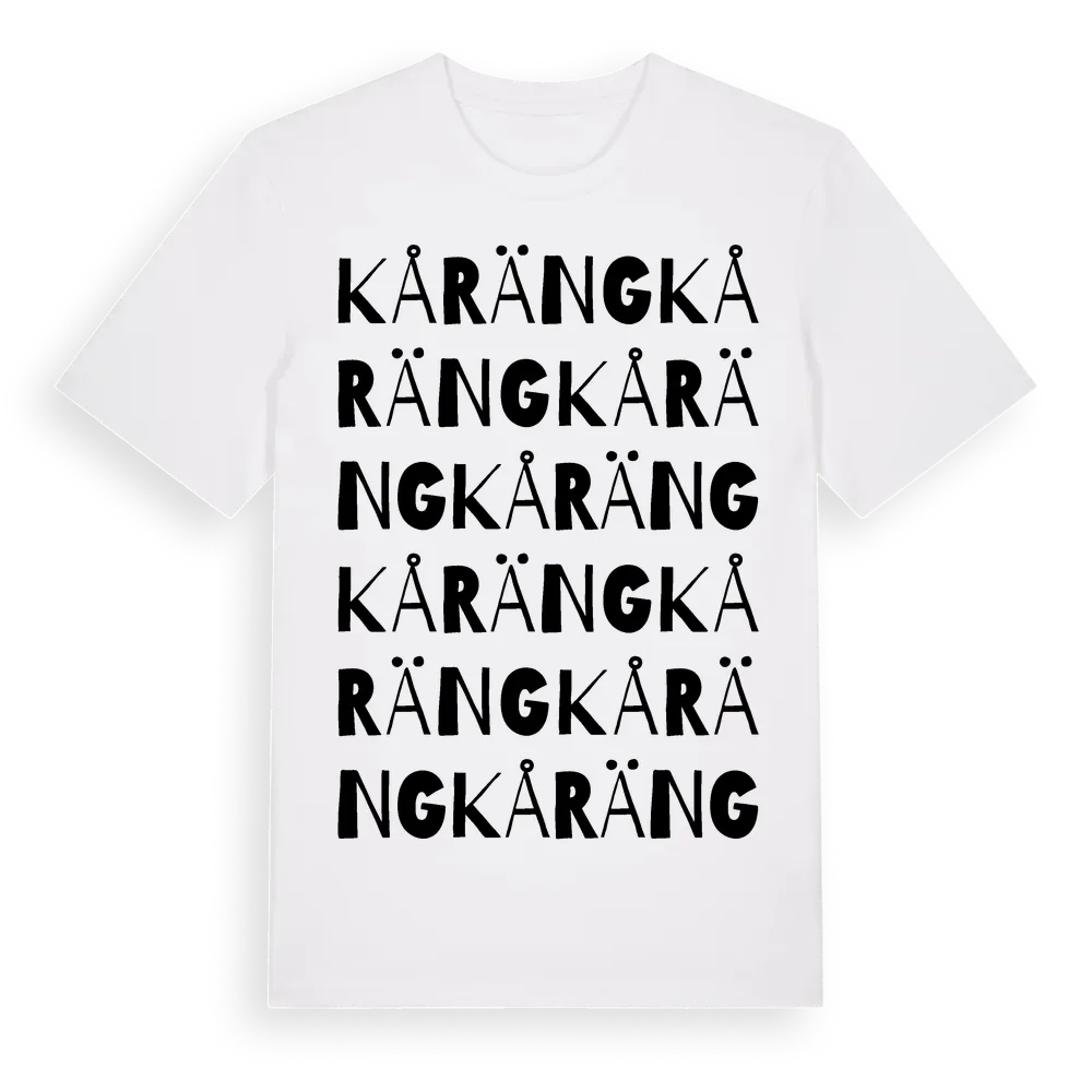 Kåräng ordlek t-shirt är inspirerad av Kåräng i Kronobergs län, Sverige. Tröjan är designad för dig som har en speciell koppling till platsen – oavsett om du bor här, har rötterna här eller bara älskar Kåräng.