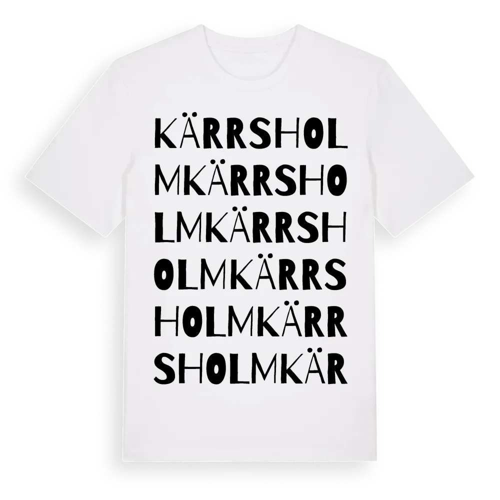 Kärrsholm ordlek t-shirt är inspirerad av Kärrsholm i Kronobergs län, Sverige. Tröjan är designad för dig som har en speciell koppling till platsen – oavsett om du bor här, har rötterna här eller bara älskar Kärrsholm.