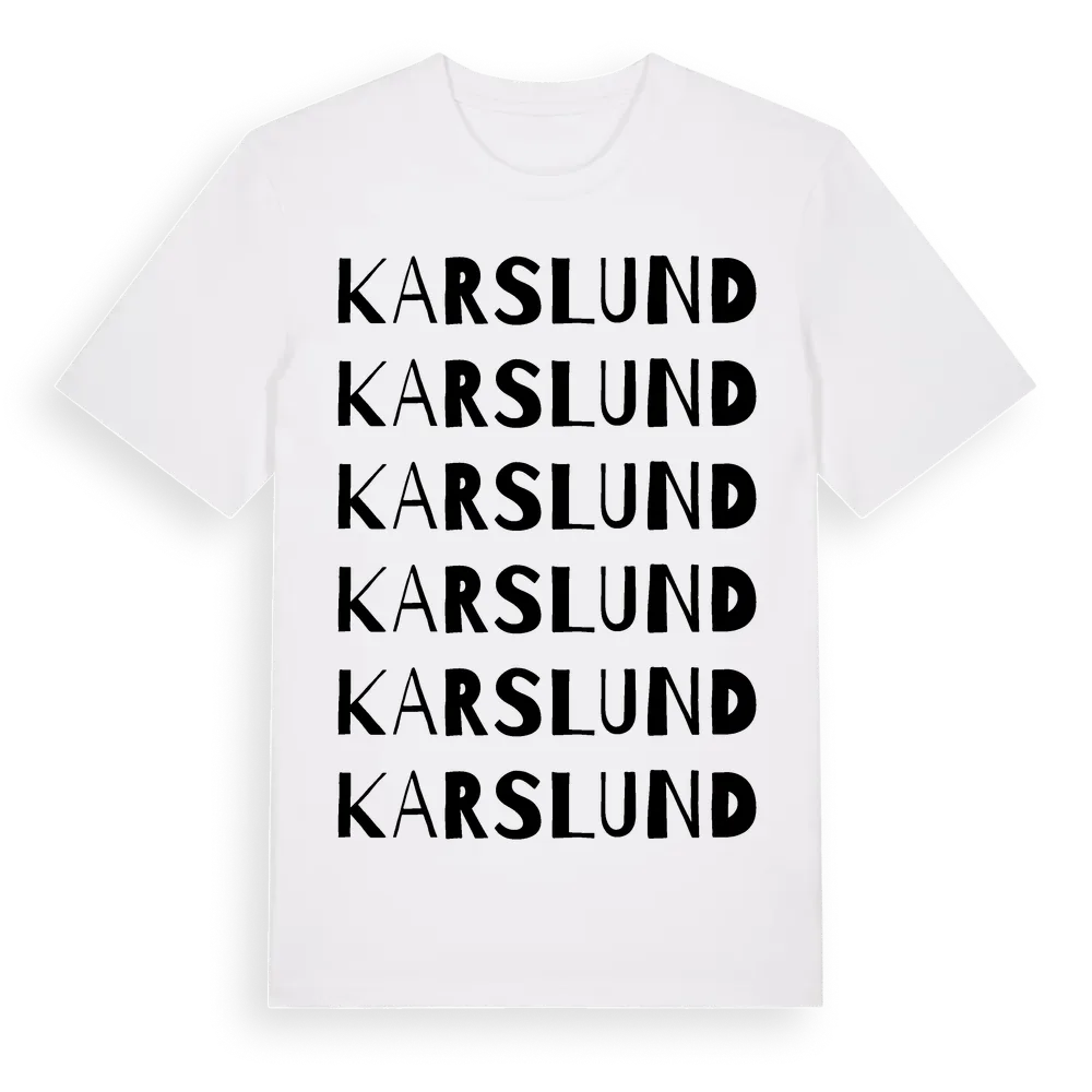 Karslund ordlek t-shirt är inspirerad av Karslund i Kronobergs län, Sverige. Tröjan är designad för dig som har en speciell koppling till platsen – oavsett om du bor här, har rötterna här eller bara älskar Karslund.