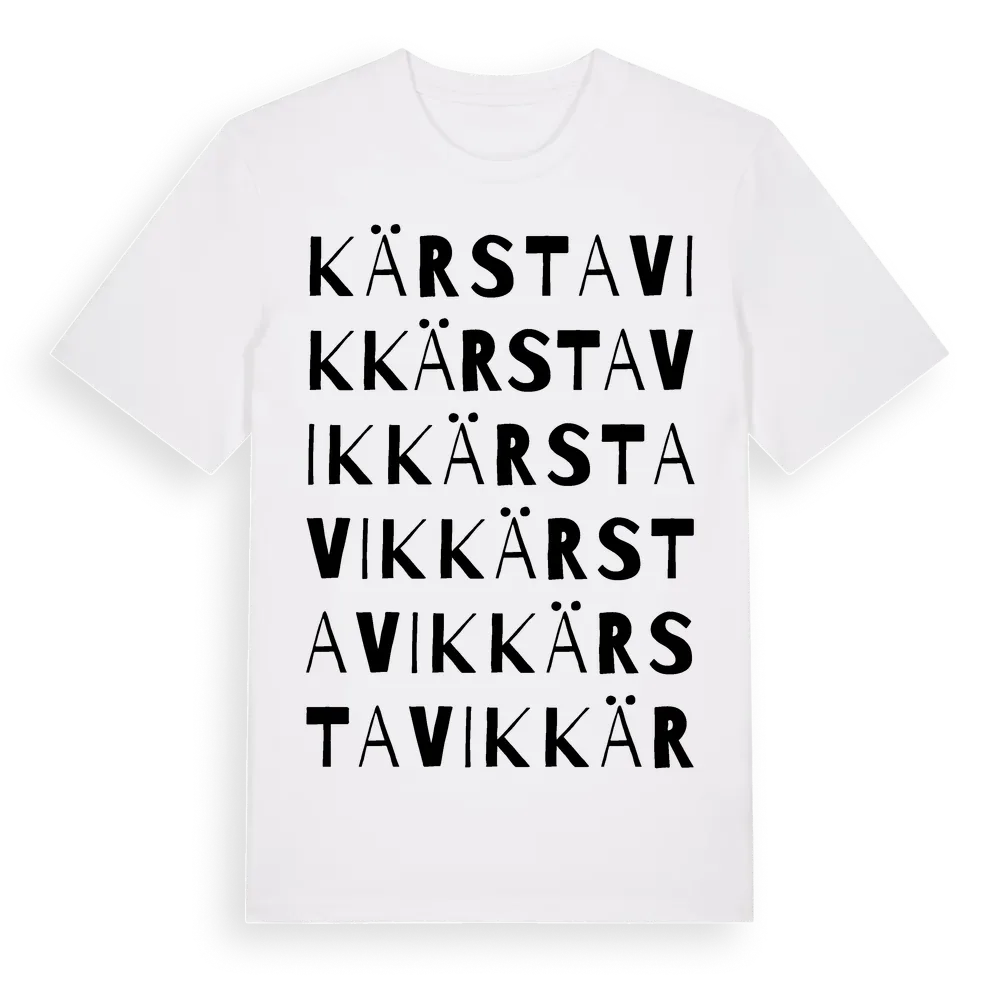 Kärstavik ordlek t-shirt är inspirerad av Kärstavik i Kronobergs län, Sverige. Tröjan är designad för dig som har en speciell koppling till platsen – oavsett om du bor här, har rötterna här eller bara älskar Kärstavik.