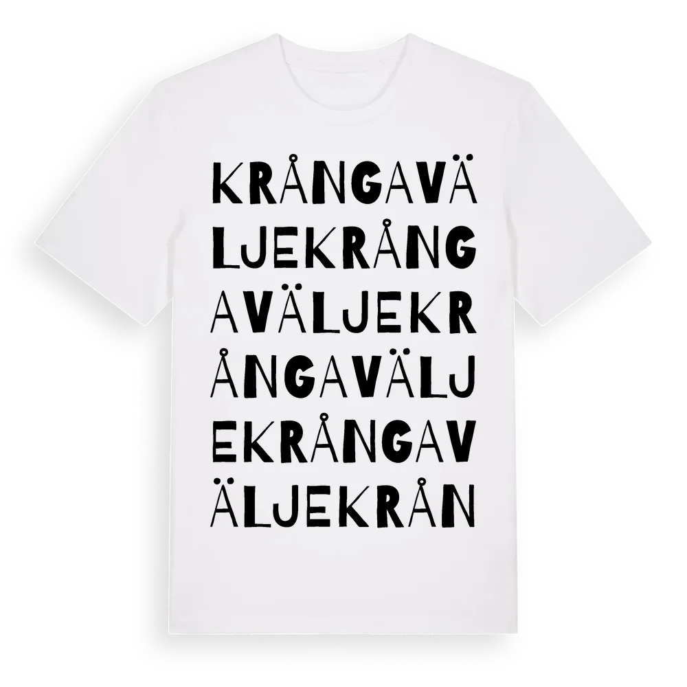 Krångavälje ordlek t-shirt är inspirerad av Krångavälje i Kronobergs län, Sverige. Tröjan är designad för dig som har en speciell koppling till platsen – oavsett om du bor här, har rötterna här eller bara älskar Krångavälje.