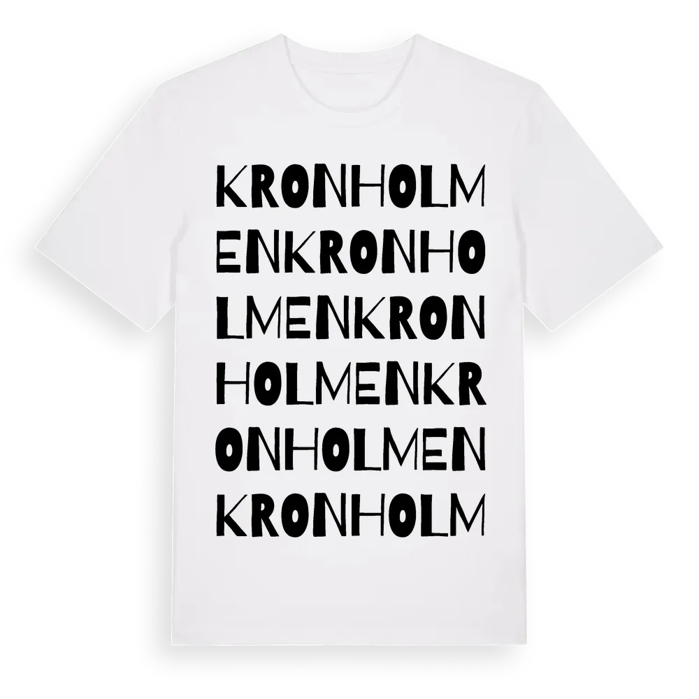 Kronholmen ordlek t-shirt är inspirerad av Kronholmen i Kronobergs län, Sverige. Tröjan är designad för dig som har en speciell koppling till platsen – oavsett om du bor här, har rötterna här eller bara älskar Kronholmen.