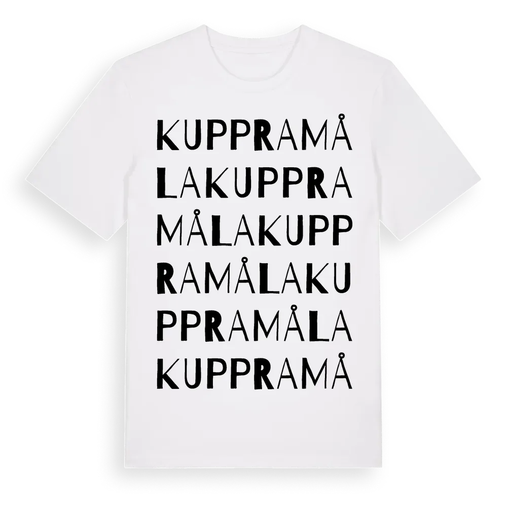 Kuppramåla ordlek t-shirt är inspirerad av byn Kuppramåla i Kronobergs län, Sverige. Tröjan är designad för dig som har en speciell koppling till platsen – oavsett om du bor här, har rötterna här eller bara älskar Kuppramåla.
