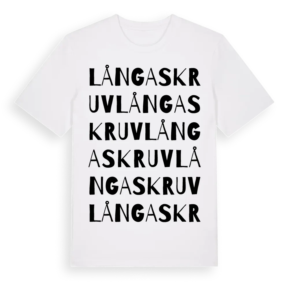 Långaskruv ordlek t-shirt är inspirerad av byn Långaskruv i Kronobergs län, Sverige. Tröjan är designad för dig som har en speciell koppling till platsen – oavsett om du bor här, har rötterna här eller bara älskar Långaskruv.