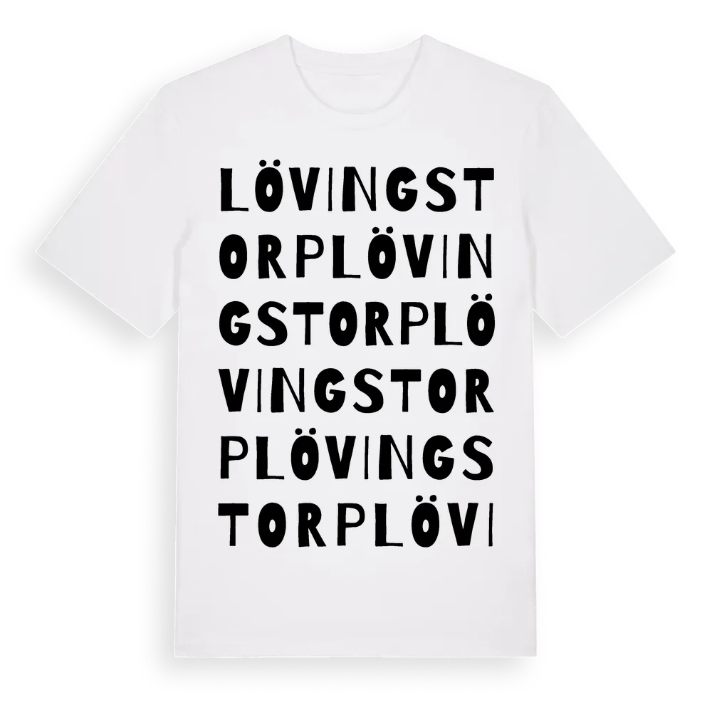 Lövingstorp ordlek t-shirt är inspirerad av Lövingstorp i Kronobergs län, Sverige. Tröjan är designad för dig som har en speciell koppling till platsen – oavsett om du bor här, har rötterna här eller bara älskar Lövingstorp.
