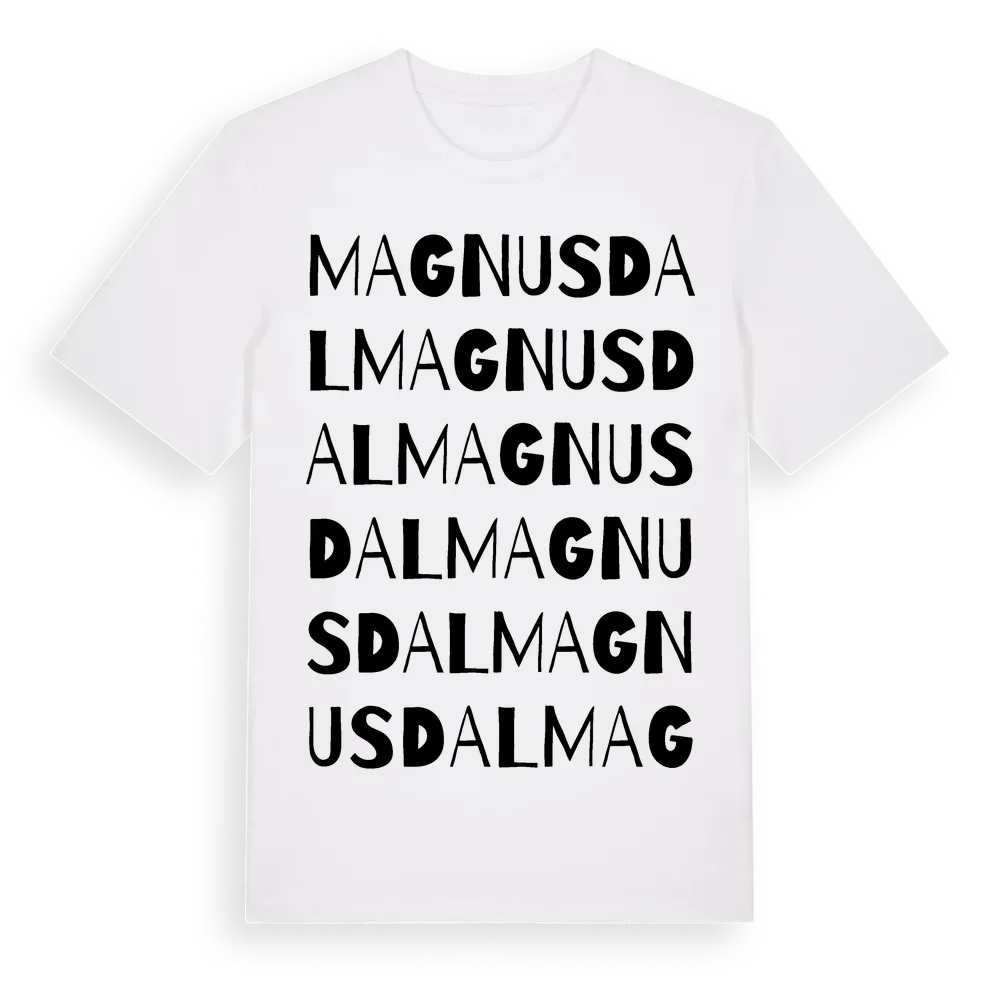 Magnusdal ordlek t-shirt är inspirerad av Magnusdal i Kronobergs län, Sverige. Tröjan är designad för dig som har en speciell koppling till platsen – oavsett om du bor här, har rötterna här eller bara älskar Magnusdal.
