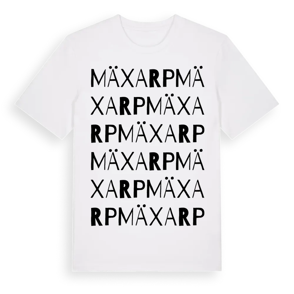 Mäxarp ordlek t-shirt är inspirerad av byn Mäxarp i Kronobergs län, Sverige. Tröjan är designad för dig som har en speciell koppling till platsen – oavsett om du bor här, har rötterna här eller bara älskar Mäxarp.