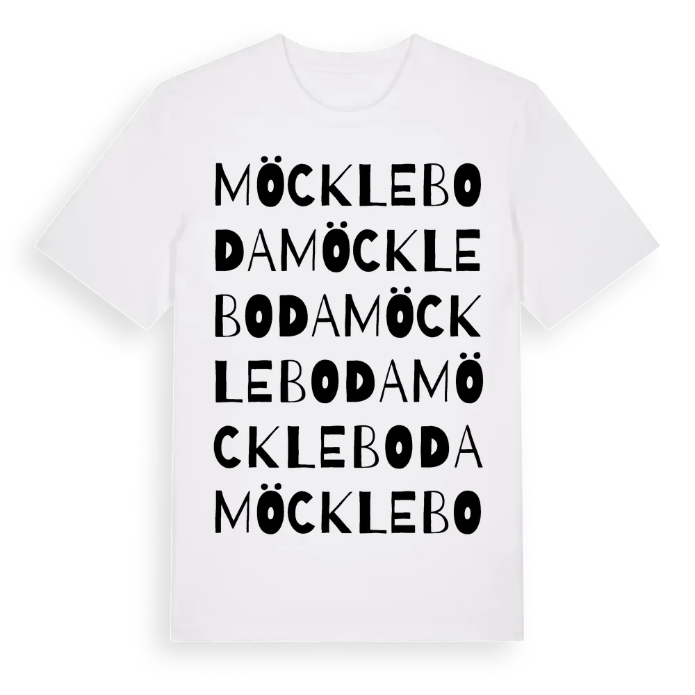 Möckleboda ordlek t-shirt är inspirerad av byn Möckleboda i Kronobergs län, Sverige. Tröjan är designad för dig som har en speciell koppling till platsen – oavsett om du bor här, har rötterna här eller bara älskar Möckleboda.