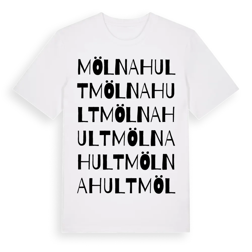Mölnahult ordlek t-shirt är inspirerad av Mölnahult i Kronobergs län, Sverige. Tröjan är designad för dig som har en speciell koppling till platsen – oavsett om du bor här, har rötterna här eller bara älskar Mölnahult.