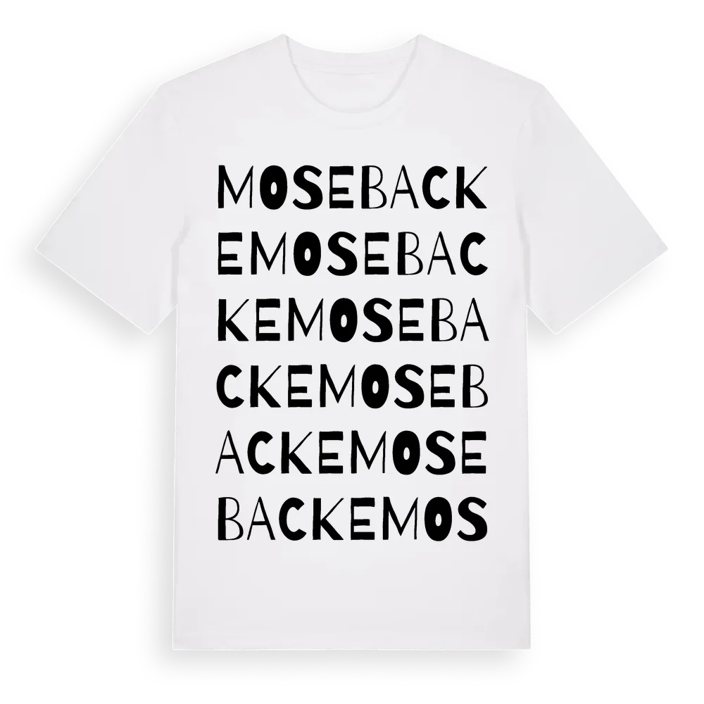 En ordlek byggd på Mosebackes namn. Subtilt och klurig – ett motiv som bara de som verkligen känner platsen fullt ut förstår. Premium bomull, unisex – från Mosebacke i Kronobergs län.