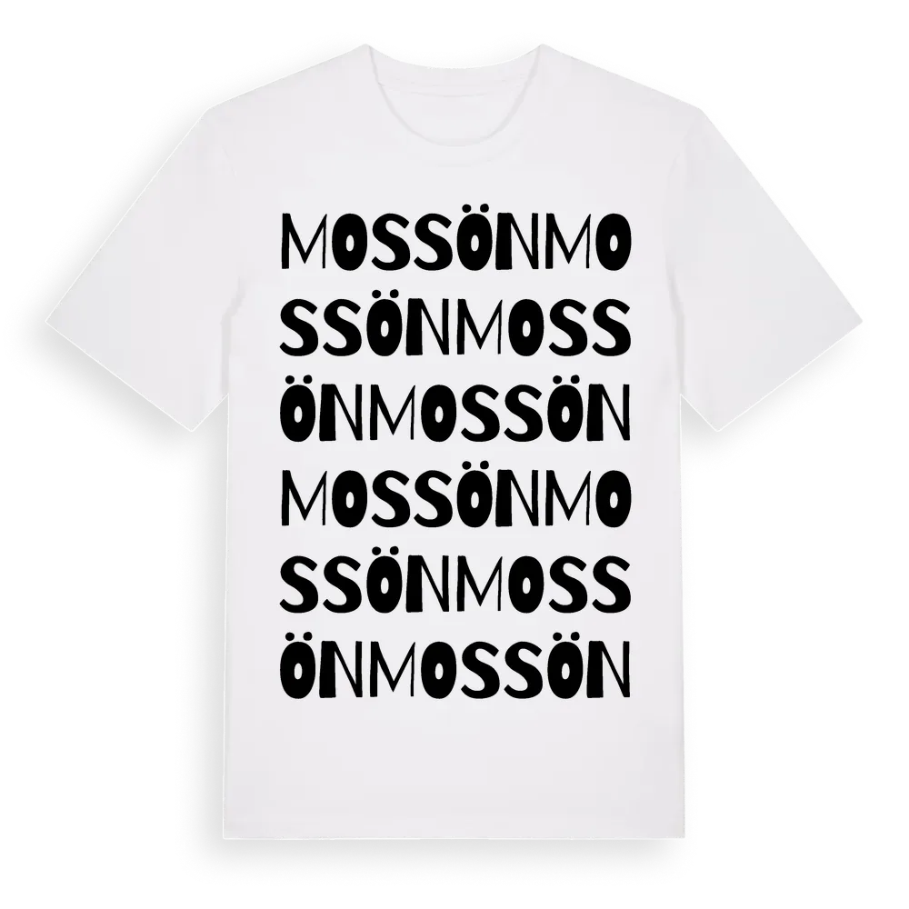 Mossön ordlek t-shirt är inspirerad av Mossön i Kronobergs län, Sverige. Tröjan är designad för dig som har en speciell koppling till platsen – oavsett om du bor här, har rötterna här eller bara älskar Mossön.