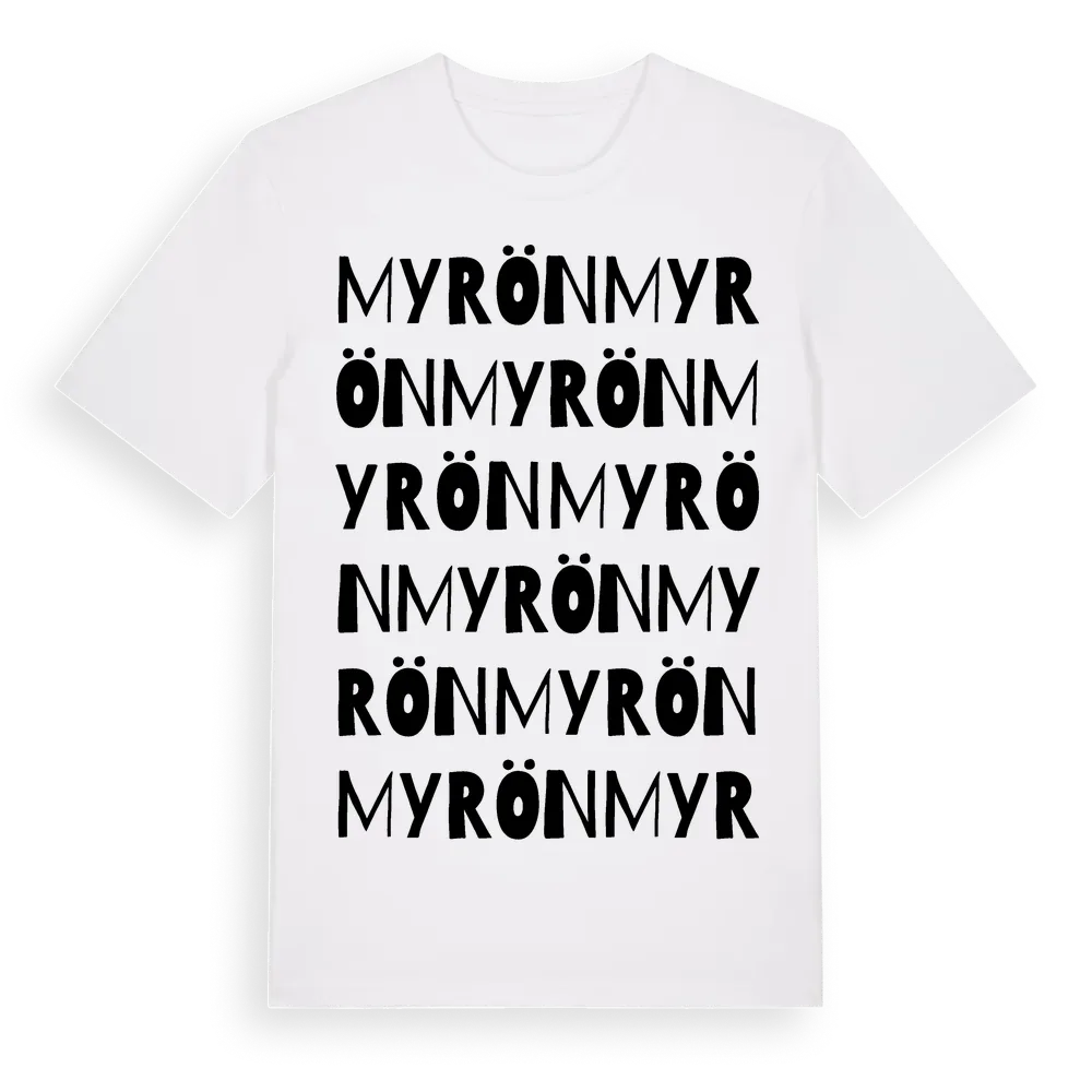 Myrön ordlek t-shirt är inspirerad av Myrön i Kronobergs län, Sverige. Tröjan är designad för dig som har en speciell koppling till platsen – oavsett om du bor här, har rötterna här eller bara älskar Myrön.