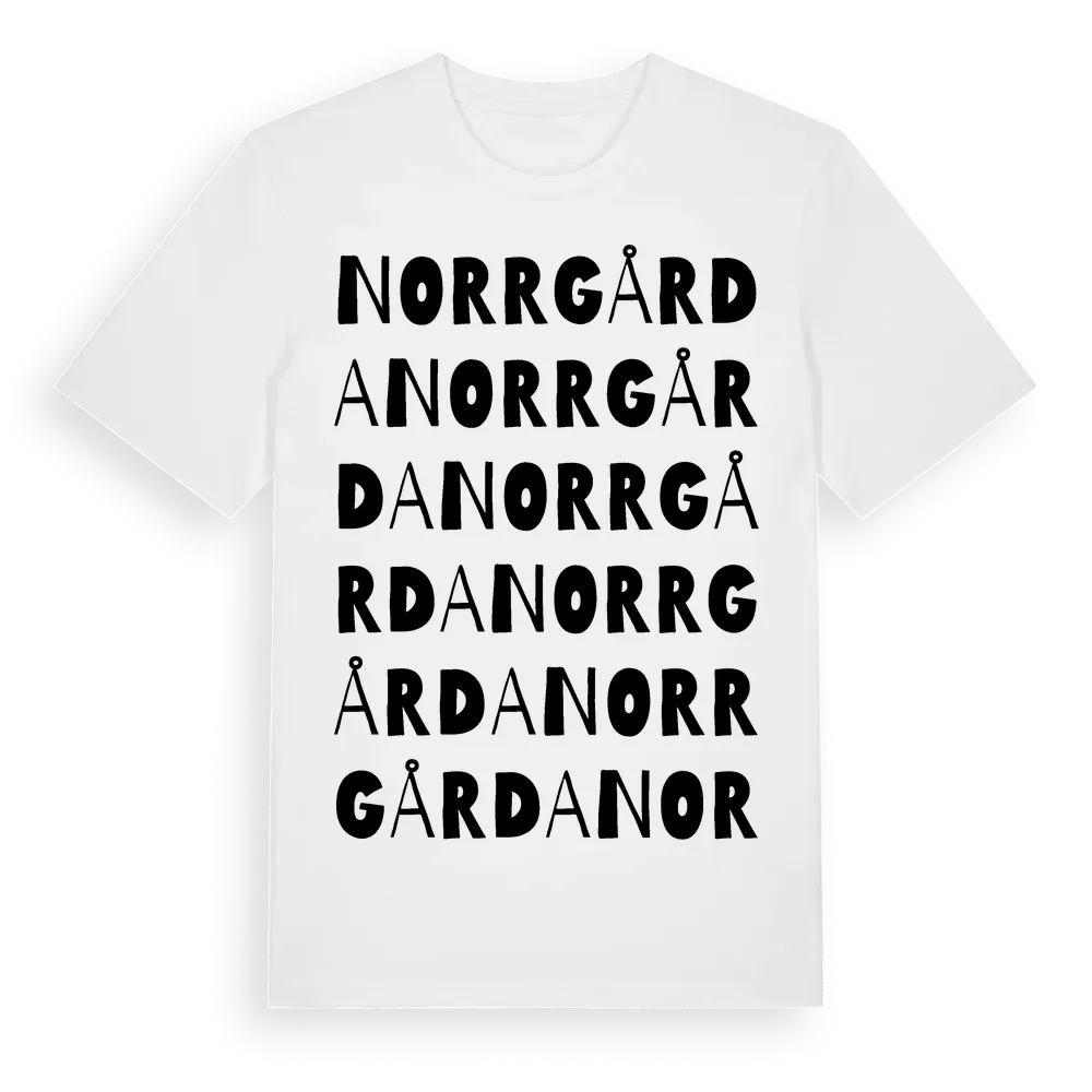 Norrgårda ordlek t-shirt är inspirerad av byn Norrgårda i Kronobergs län, Sverige. Tröjan är designad för dig som har en speciell koppling till platsen – oavsett om du bor här, har rötterna här eller bara älskar Norrgårda.