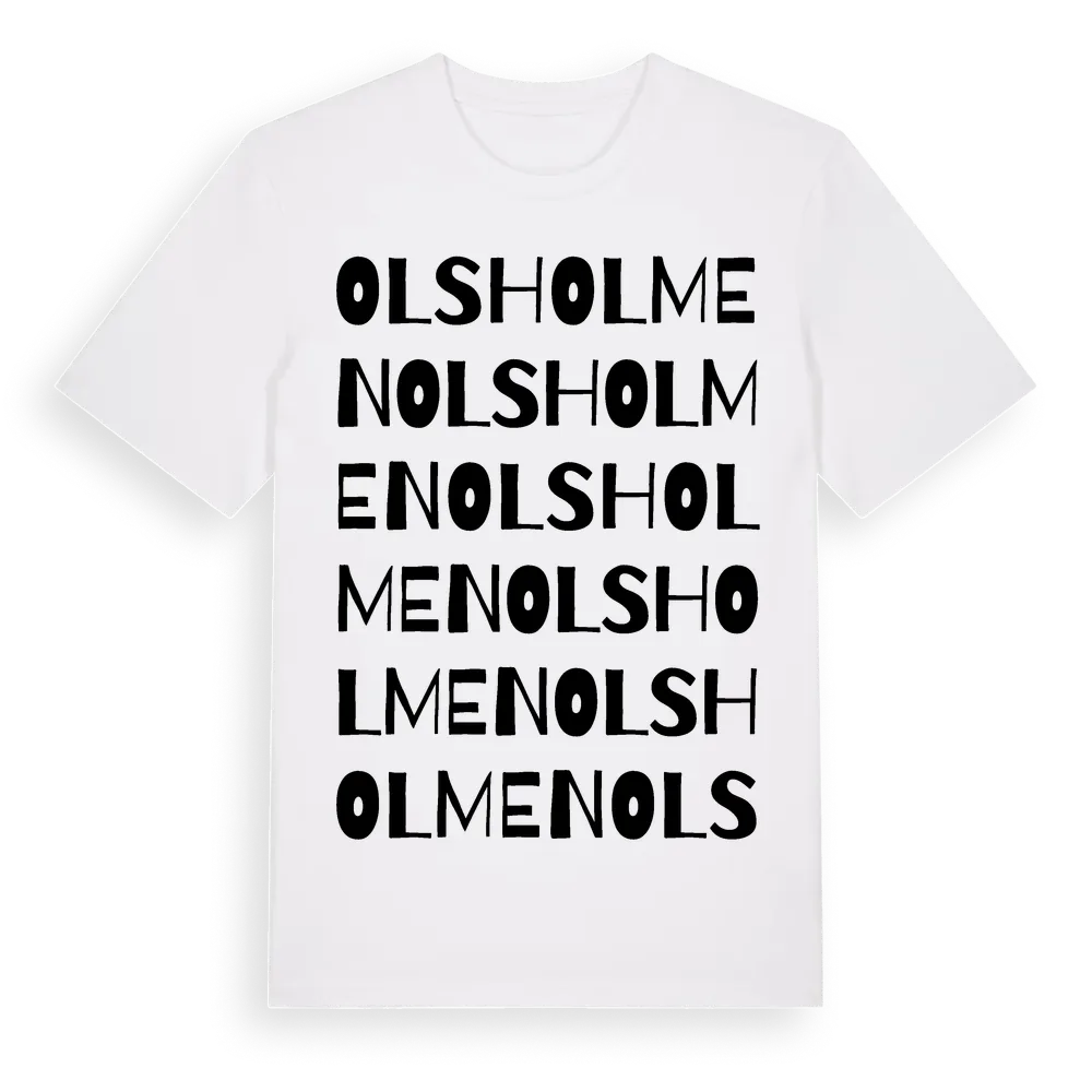 En ordlek byggd på Olsholmens namn. Subtilt och klurig – ett motiv som bara de som verkligen känner platsen fullt ut förstår. Premium bomull, unisex – från Olsholmen i Kronobergs län.