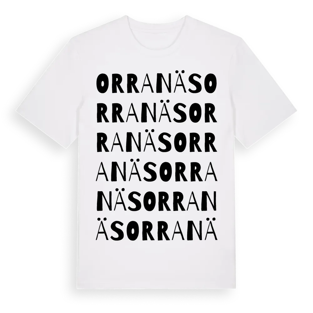 Orranäs ordlek t-shirt är inspirerad av Orranäs i Kronobergs län, Sverige. Tröjan är designad för dig som har en speciell koppling till platsen – oavsett om du bor här, har rötterna här eller bara älskar Orranäs.