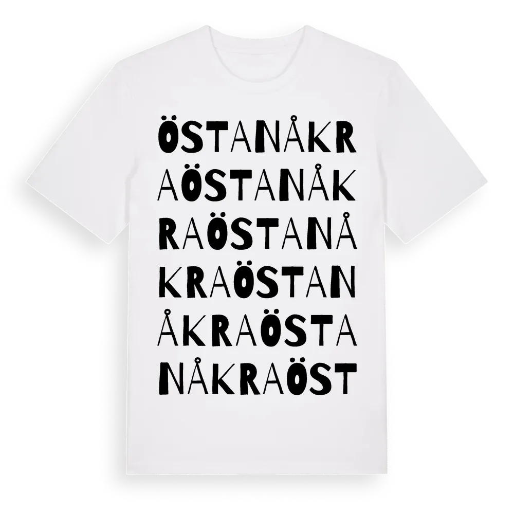 Östanåkra ordlek t-shirt är inspirerad av byn Östanåkra i Kronobergs län, Sverige. Tröjan är designad för dig som har en speciell koppling till platsen – oavsett om du bor här, har rötterna här eller bara älskar Östanåkra.