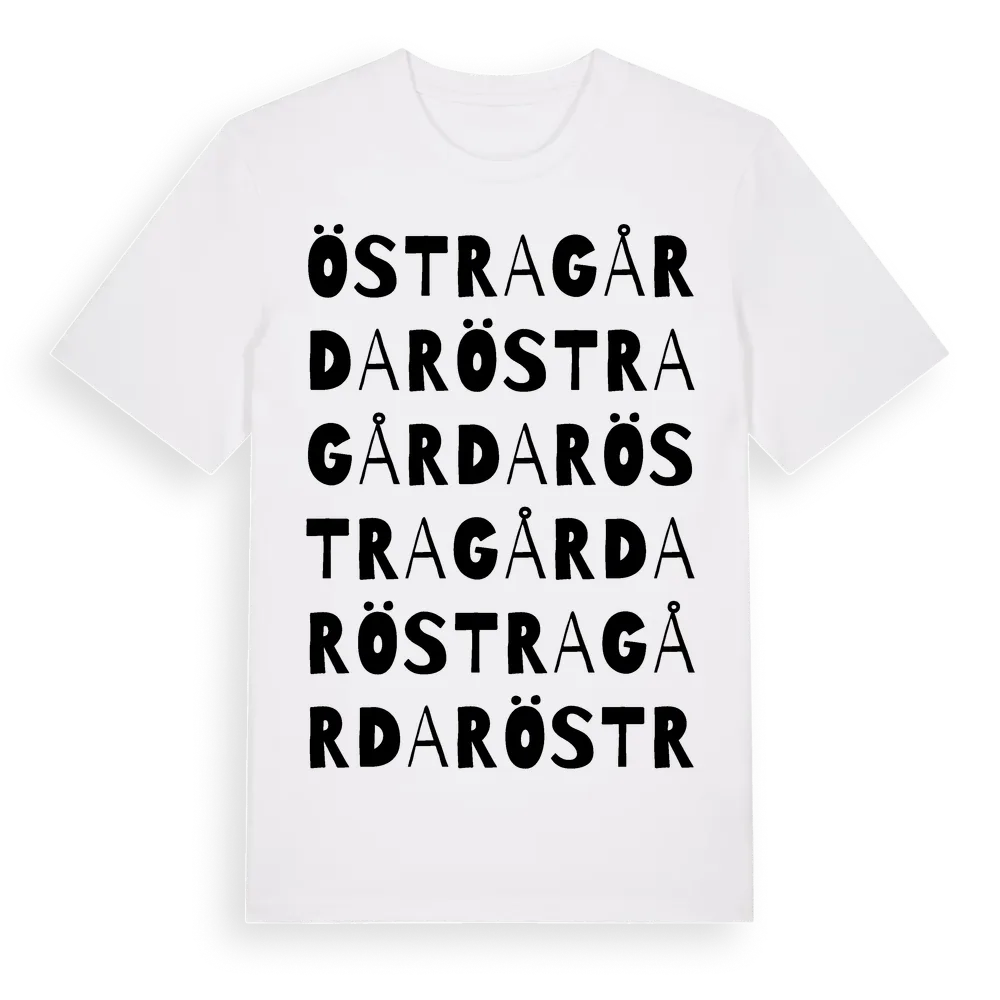 Östra Gårdar ordlek t-shirt är inspirerad av Östra Gårdar i Kronobergs län, Sverige. Tröjan är designad för dig som har en speciell koppling till platsen – oavsett om du bor här, har rötterna här eller bara älskar Östra Gårdar.