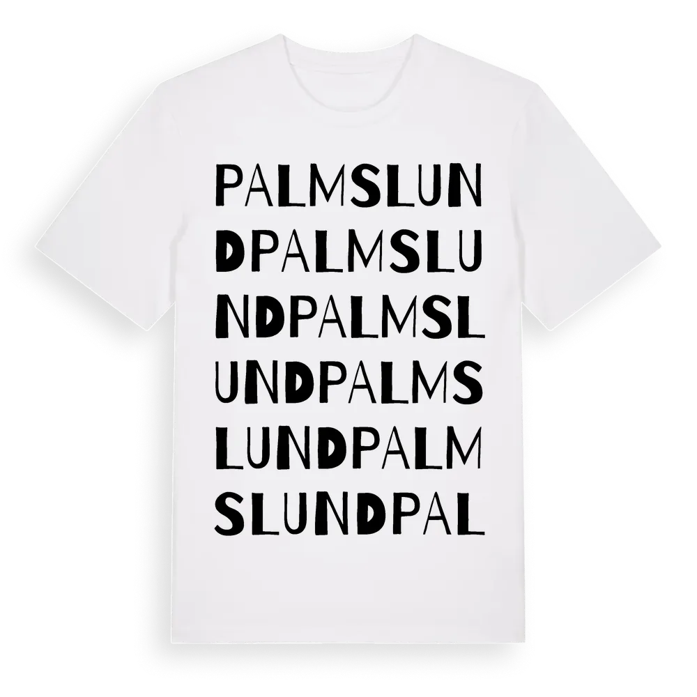 Palmslund ordlek t-shirt är inspirerad av Palmslund i Kronobergs län, Sverige. Tröjan är designad för dig som har en speciell koppling till platsen – oavsett om du bor här, har rötterna här eller bara älskar Palmslund.