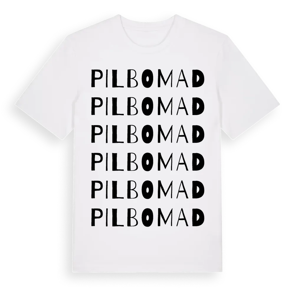 Pilbomad ordlek t-shirt är inspirerad av Pilbomad i Kronobergs län, Sverige. Tröjan är designad för dig som har en speciell koppling till platsen – oavsett om du bor här, har rötterna här eller bara älskar Pilbomad.