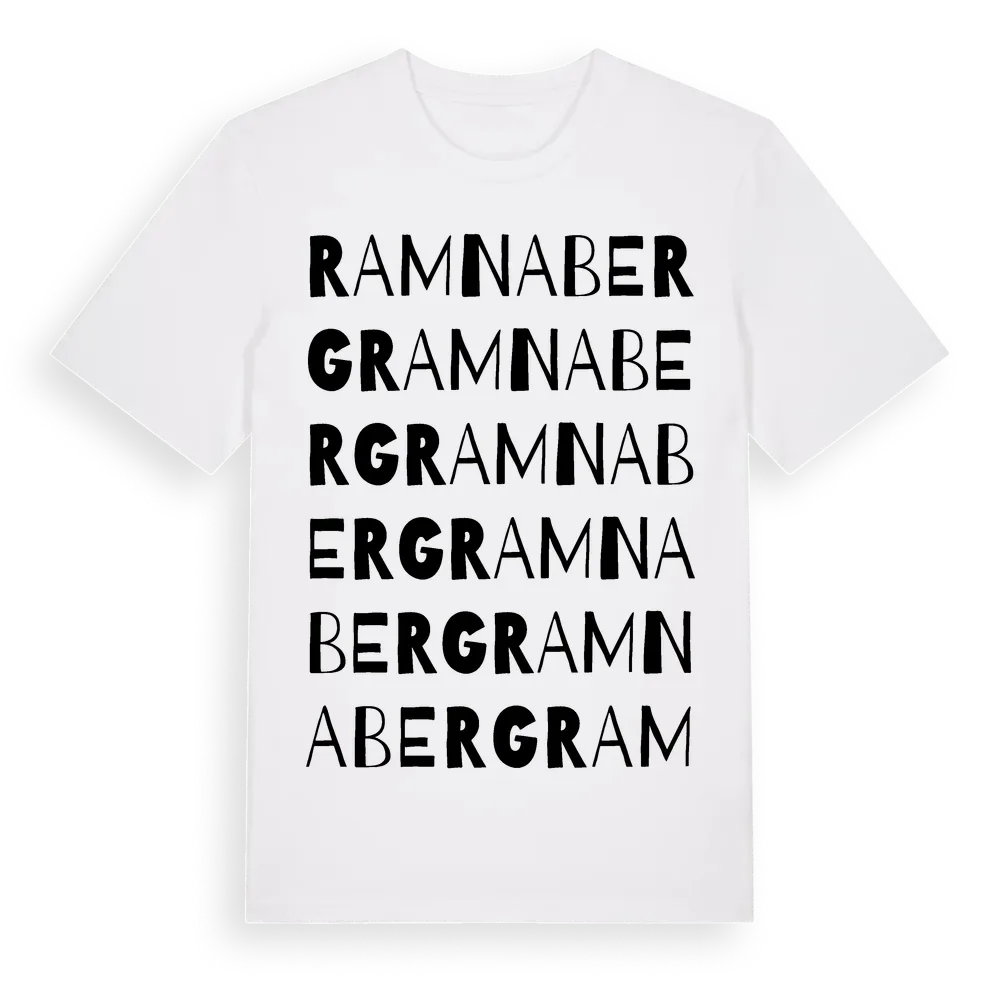 Ramnaberg ordlek t-shirt är inspirerad av Ramnaberg i Kronobergs län, Sverige. Tröjan är designad för dig som har en speciell koppling till platsen – oavsett om du bor här, har rötterna här eller bara älskar Ramnaberg.