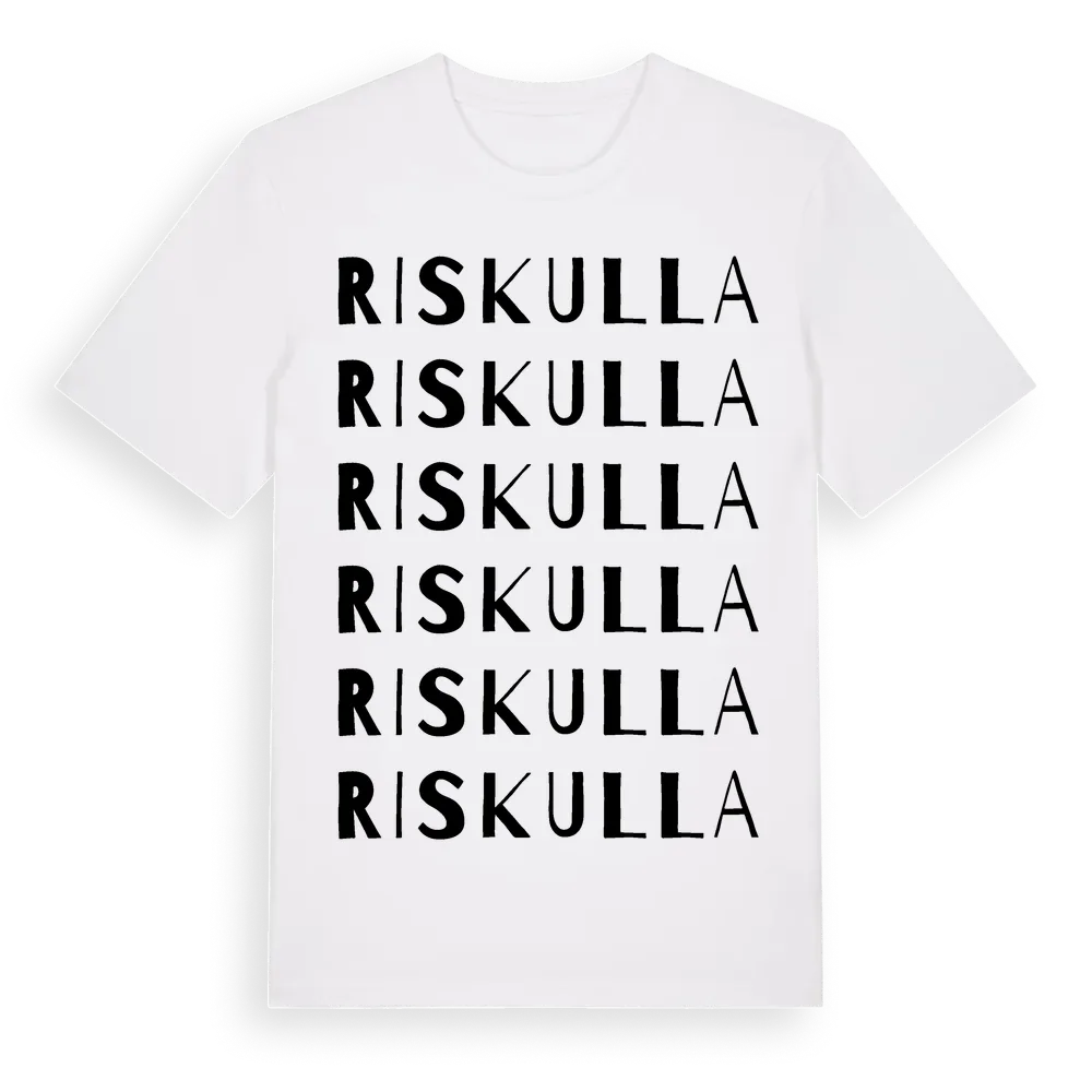 En ordlek byggd på Riskullas namn. Subtilt och klurig – ett motiv som bara de som verkligen känner platsen fullt ut förstår. Premium bomull, unisex – från stadsdelen Riskulla i Kronobergs län.