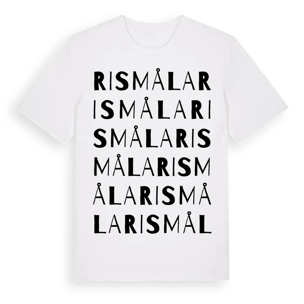 Rismåla ordlek t-shirt är inspirerad av byn Rismåla i Kronobergs län, Sverige. Tröjan är designad för dig som har en speciell koppling till platsen – oavsett om du bor här, har rötterna här eller bara älskar Rismåla.