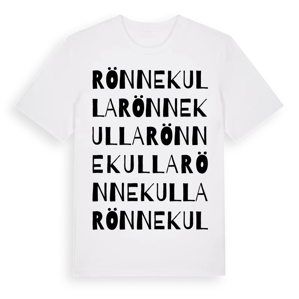 Rönnekulla ordlek t-shirt är inspirerad av byn Rönnekulla i Kronobergs län, Sverige. Tröjan är designad för dig som har en speciell koppling till platsen – oavsett om du bor här, har rötterna här eller bara älskar Rönnekulla.