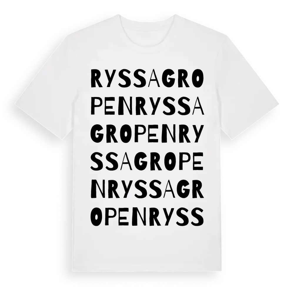 Ryssagropen ordlek t-shirt är inspirerad av Ryssagropen i Kronobergs län, Sverige. Tröjan är designad för dig som har en speciell koppling till platsen – oavsett om du bor här, har rötterna här eller bara älskar Ryssagropen.