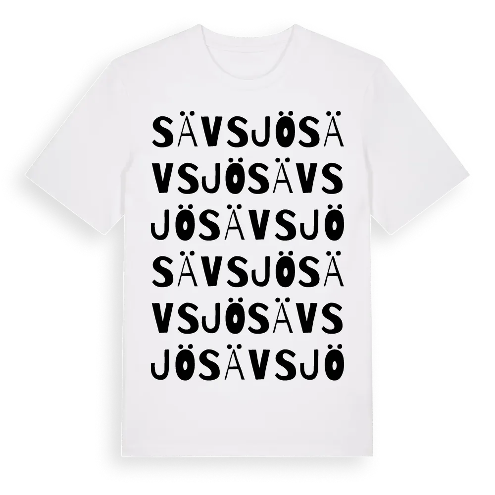 Sävsjö ordlek t-shirt är inspirerad av byn Sävsjö i Kronobergs län, Sverige. Tröjan är designad för dig som har en speciell koppling till platsen – oavsett om du bor här, har rötterna här eller bara älskar Sävsjö.