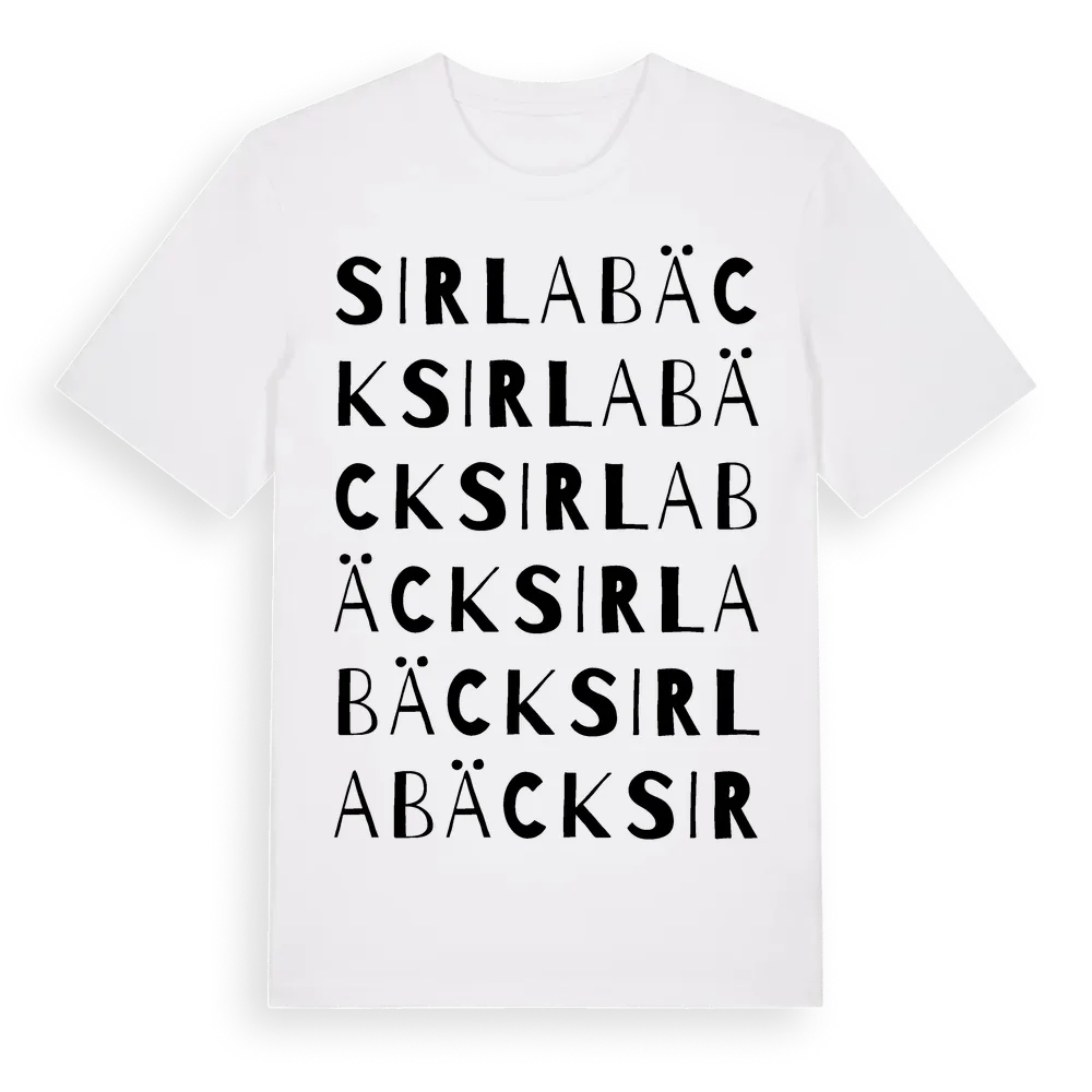 Sirlabäck ordlek t-shirt är inspirerad av Sirlabäck i Kronobergs län, Sverige. Tröjan är designad för dig som har en speciell koppling till platsen – oavsett om du bor här, har rötterna här eller bara älskar Sirlabäck.