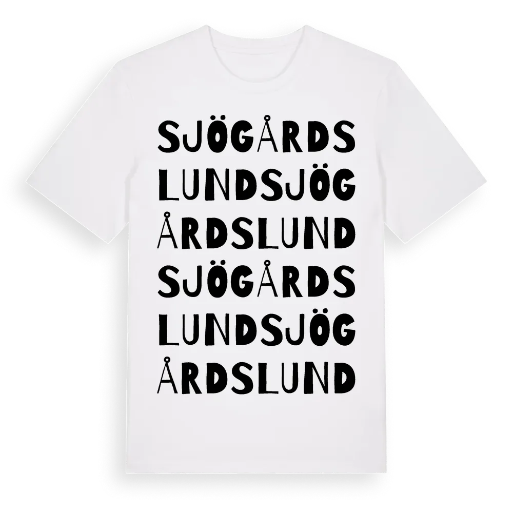 Sjögårdslund ordlek t-shirt är inspirerad av Sjögårdslund i Kronobergs län, Sverige. Tröjan är designad för dig som har en speciell koppling till platsen – oavsett om du bor här, har rötterna här eller bara älskar Sjögårdslund.