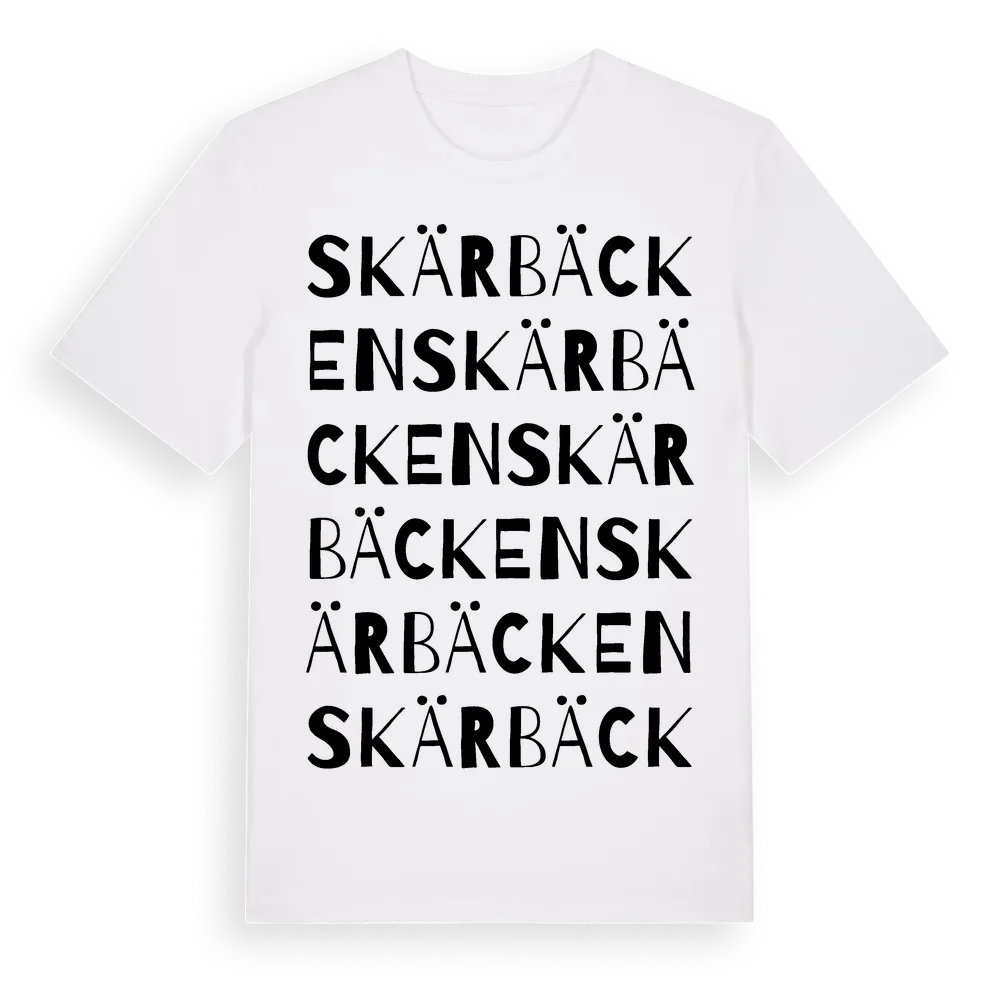 Skärbäcken ordlek t-shirt är inspirerad av Skärbäcken i Kronobergs län, Sverige. Tröjan är designad för dig som har en speciell koppling till platsen – oavsett om du bor här, har rötterna här eller bara älskar Skärbäcken.