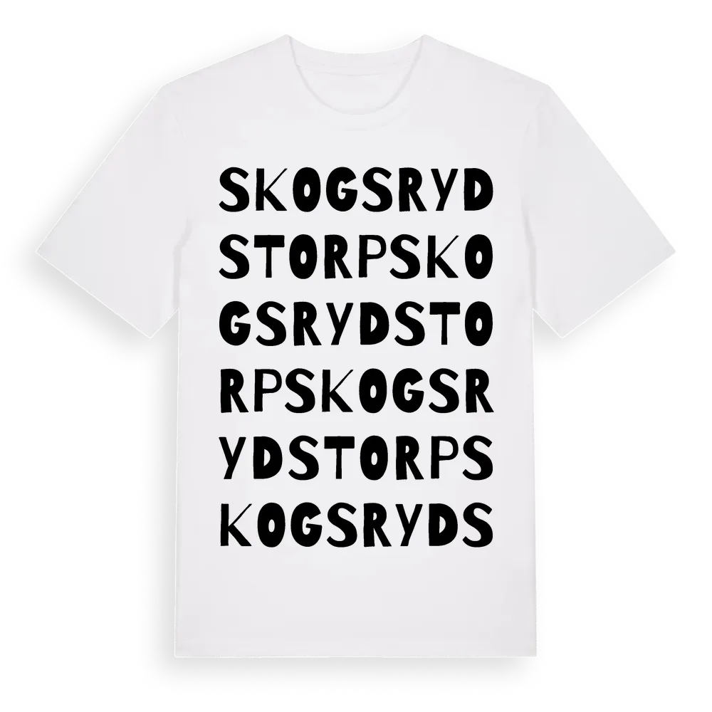 Skogsrydstorp ordlek t-shirt är inspirerad av Skogsrydstorp i Kronobergs län, Sverige. Tröjan är designad för dig som har en speciell koppling till platsen – oavsett om du bor här, har rötterna här eller bara älskar Skogsrydstorp.